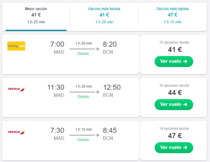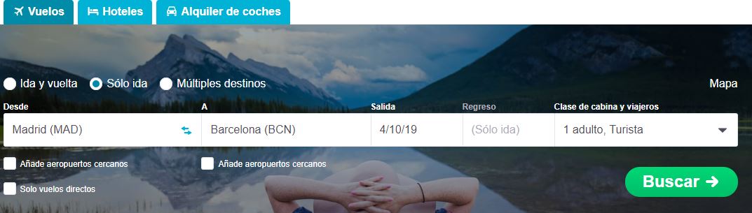 Veamos un ejemplo, busquemos un vuelo de solo ida, de Madrid a Barcelona, seleccionamos los parámetros que deseamos en el buscador: